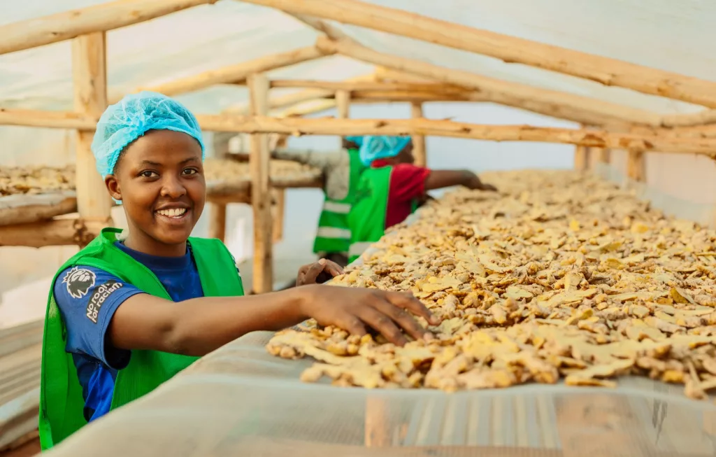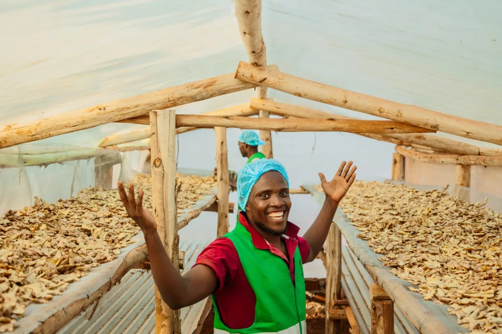 Sairus Kiggundu — Kibajjo Agro-Processors, Uganda. Kleinbauern in Uganda verlieren einen Großteil ihrer Ernte durch fehlende Lagerung und Verarbeitung sowie durch Zwischenhändler, die die Preise diktieren. Sairus trocknet, verarbeitet und verpackt lokal angebauten Ingwer mit Solartrocknern und verkauft ihn als zertifiziertes Produkt direkt auf dem Markt. Das soll das Einkommen der beteiligten Bauernfamilien um 40 Prozent steigern und zeigt, dass Wertschöpfung auch in ländlichen Regionen möglich ist.